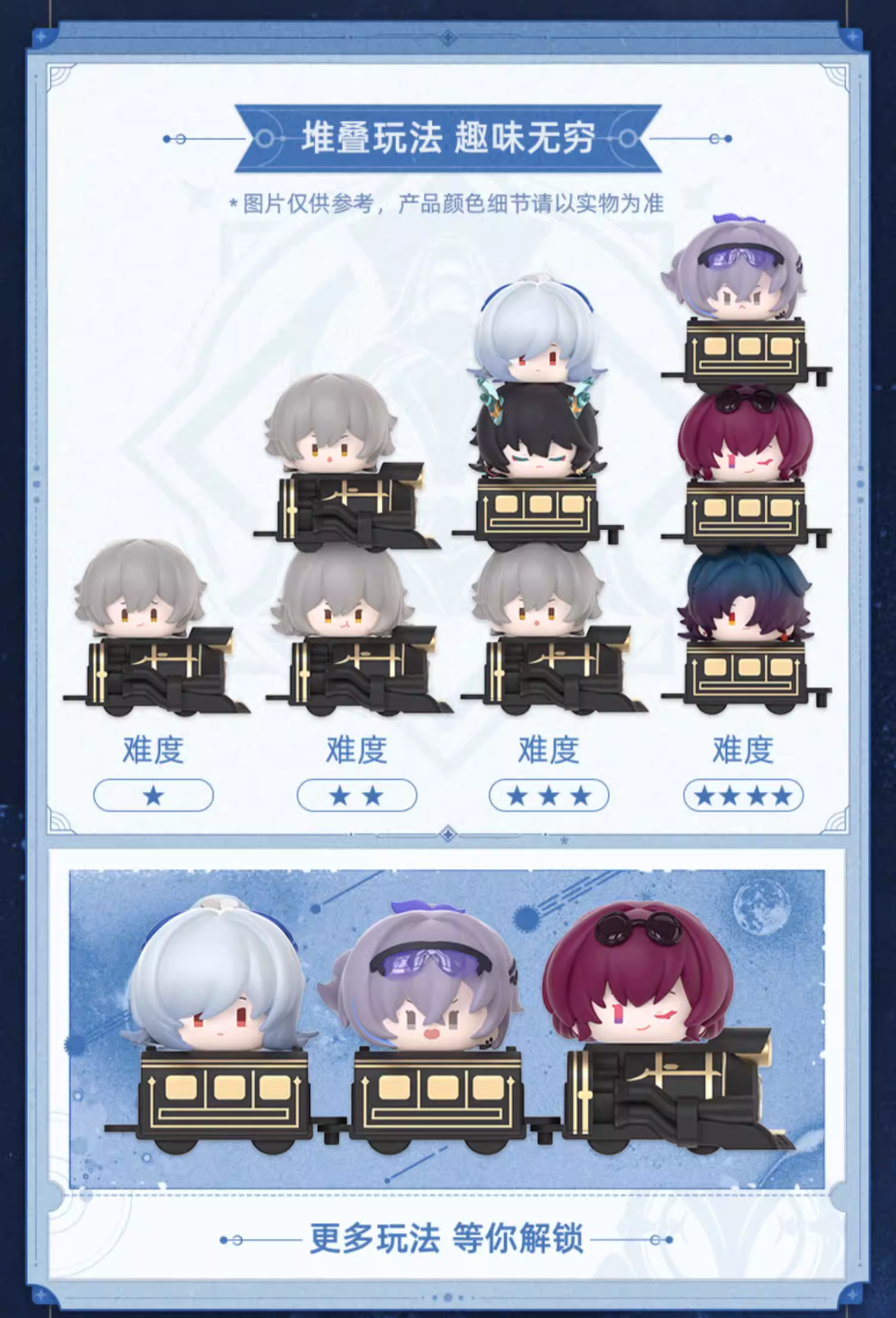 Popular game characters reimagined in cute chibi style; Creative stacking for stress-relief fun; Desktop display with multiple play modes, compact and portable. 2.36 inch