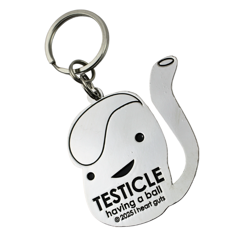 NEW five-pack! Let it all hang out with the cutest testicle keychain ever. The engraved back of the keychain and cardboard display both say: "Testicle: Having a Ball." Zinc alloy with soft enamel, polybagged. The testicle part of the keychain measures 1.93" x 1.9". Designed in the US, made in China.