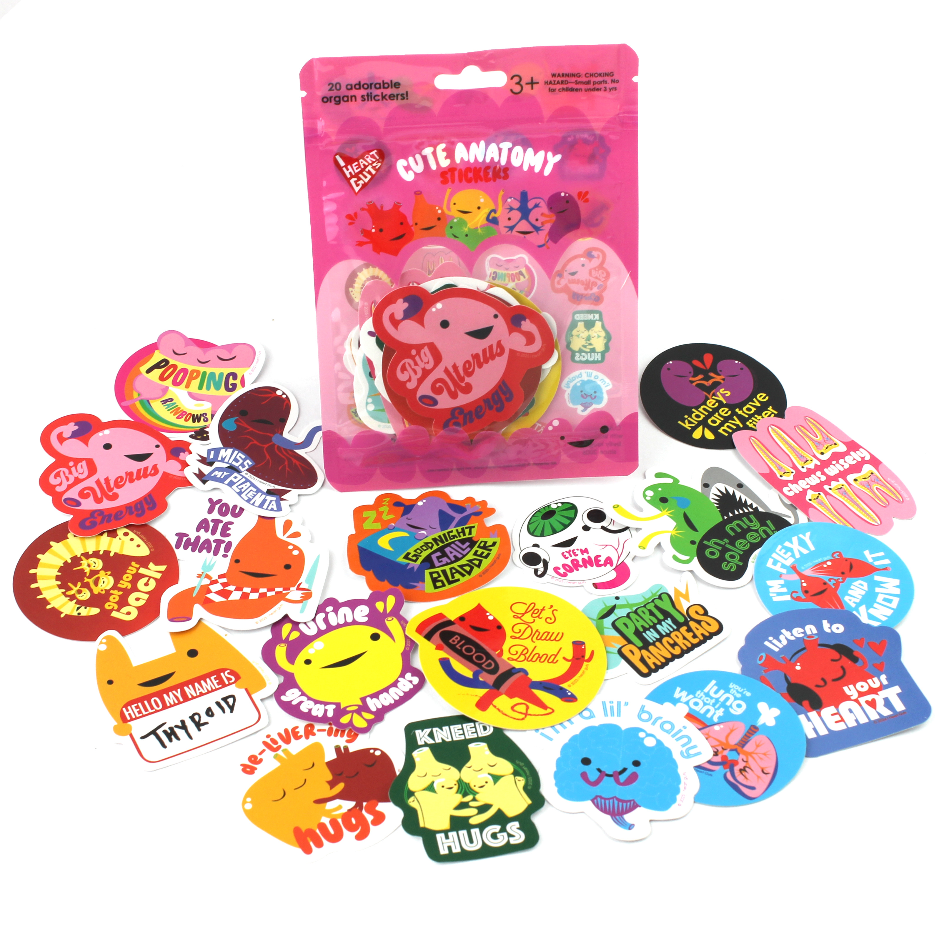 We are celebrating 20 years of I Heart Guts cute organs with this special set of 20 different cute organ sticker designs! These 2.25” outdoor-quality vinyl stickers are ready to dress up your laptop, bike, water bottle or phone case. Remember to take care of your body -- it's the only one you've got! Ages 3+.