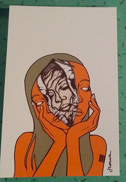 Now available, the mini print version of 'Pneuma', which contains imagery used on the west coast leg of last years Nine Inch Nails / Soundgarden U.S. Tour. Measuring approx. 10 x 6.5 inches, this mini print sports rich colors (including a metallic ink) on white gallery stock. About the artwork, Jermaine says: 'The raw and true inner self is smothered, slowly but surely, from the time we come crawling out of our maternal incubators. We are molded, prodded, branded, and manipulated. The process can result in an outer shell of spirit that doesn't resemble the raw pneuma at all. In some cases, it can take a long time to extricate yourself from yourself. A long, long time.'