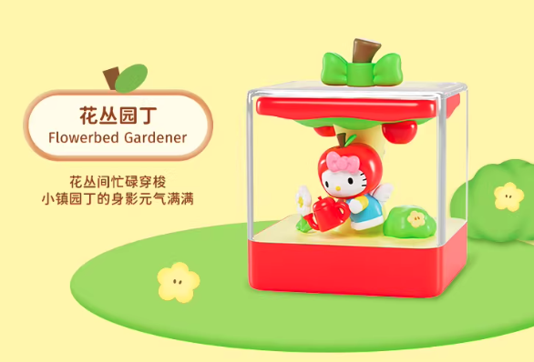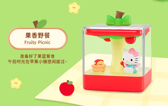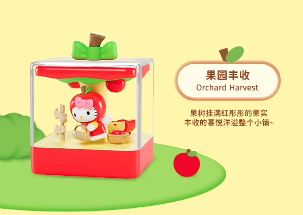Welcome to Apple Town! Sunshine and a gentle breeze mingle with the sweet scent of fruit. Enjoy a time in this charming town with Hello Kitty! 3.93 inch
