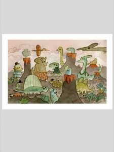 Dinosaur Day Print | Prints/Posters-Paper | Scott Campbell | Oh, my goodness. Look at all these dinosaurs just hanging about amongst the volcanoes. Not a care in the world. Well, some may have cares, i cannot be sure. I see some hats and shirts though! What the heck are dinosaurs doing wearing clothes?... more |