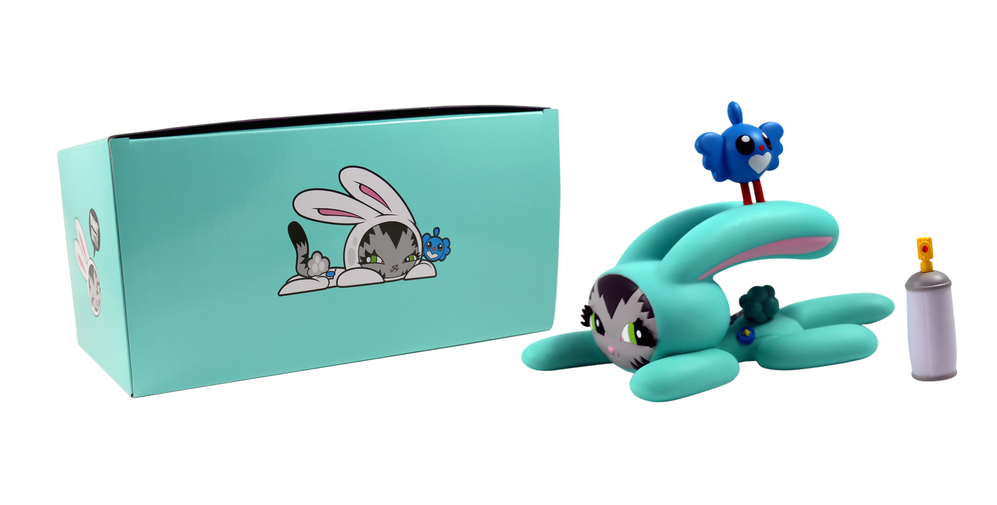 A long time and renowned street artist, Dave Persue brought his popular Bunnykitty character to life in 3D form with 3DRetro in a limited edition vinyl figure with multiple color variations. The figure is the first vinyl for the artist but the character is known all over the world thank for the artist’s shows, murals and children’s book about the character. The figure is 7 inches going across, packaged in window box.