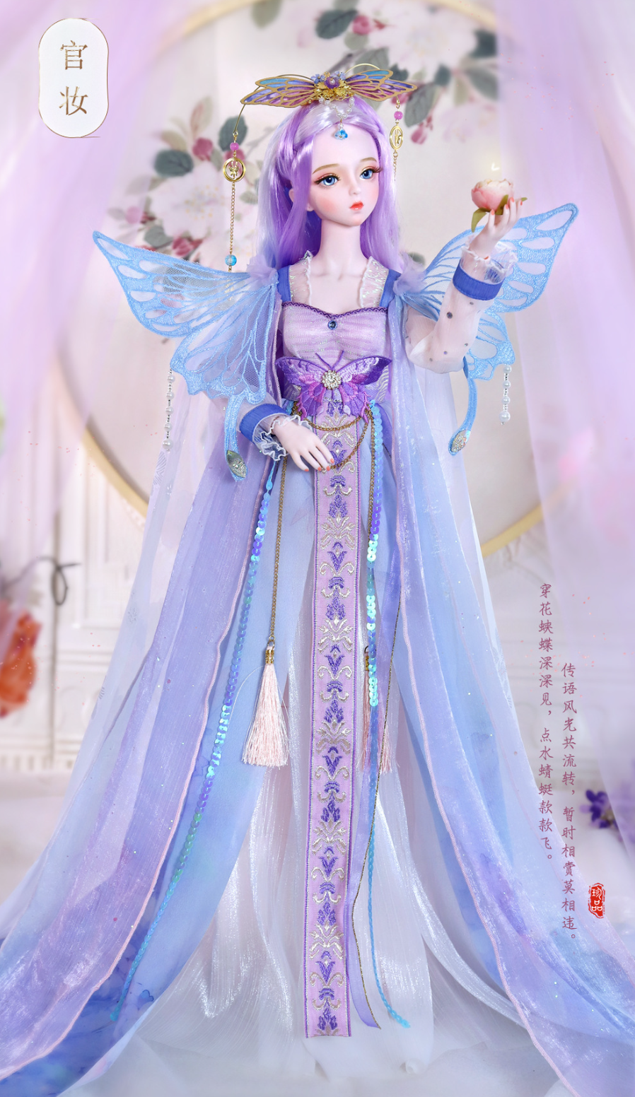 Standard features include a 34-joint, 360-degree articulated body. 3D eyes with realistic eyelashes, bright and lively gaze; exquisite handmade clothing, meticulously sewn by artisans; delicate hairstyles and headwear, with detachable and replaceable headwear. Includes 1 outfit, 23.62 inch,