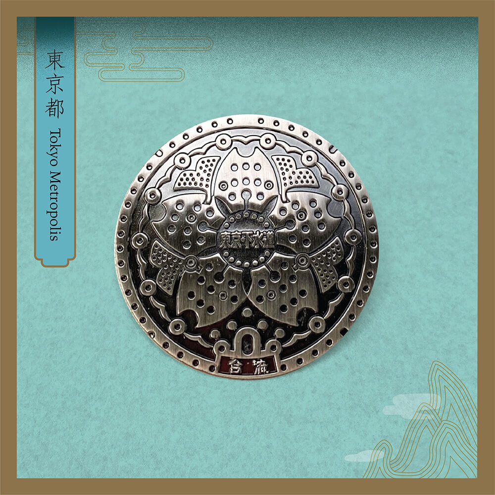 Tokyo Metropolis (東京都)Tokyo is the capital and most populous prefecture of Japan. Located at the head of Tokyo Bay, the prefecture forms part of the Kantō region. This enamel pin is based on one of the most commonly found manhole cover in Tokyo. The design depicts a sakura flower surrounded by ginkgo leaves.