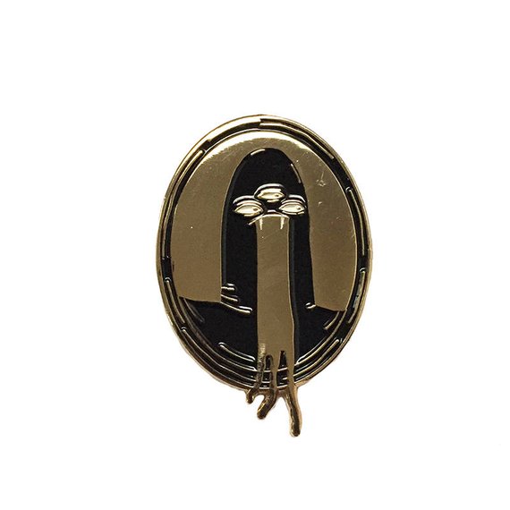 Original artwork by Dripface - Size: 1.75in. - Gold with black and white detail - Metal with duel rubber pin backings - Packaged on a 2.5in x 2.5in card