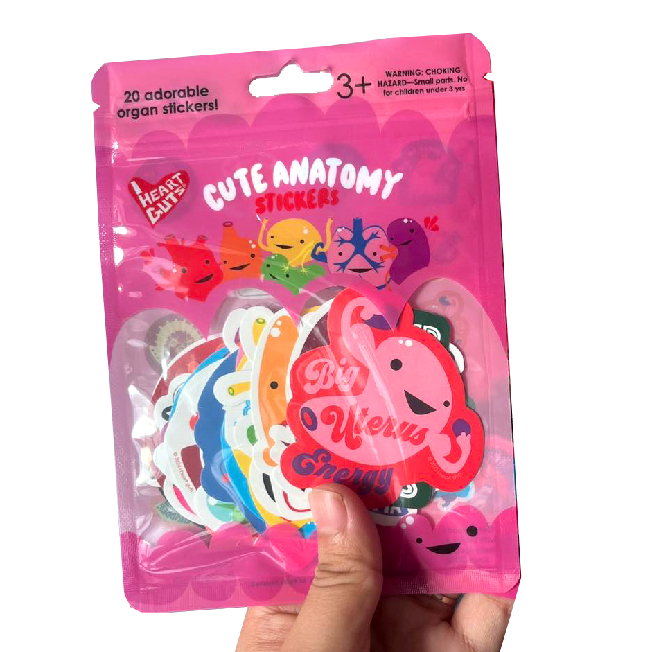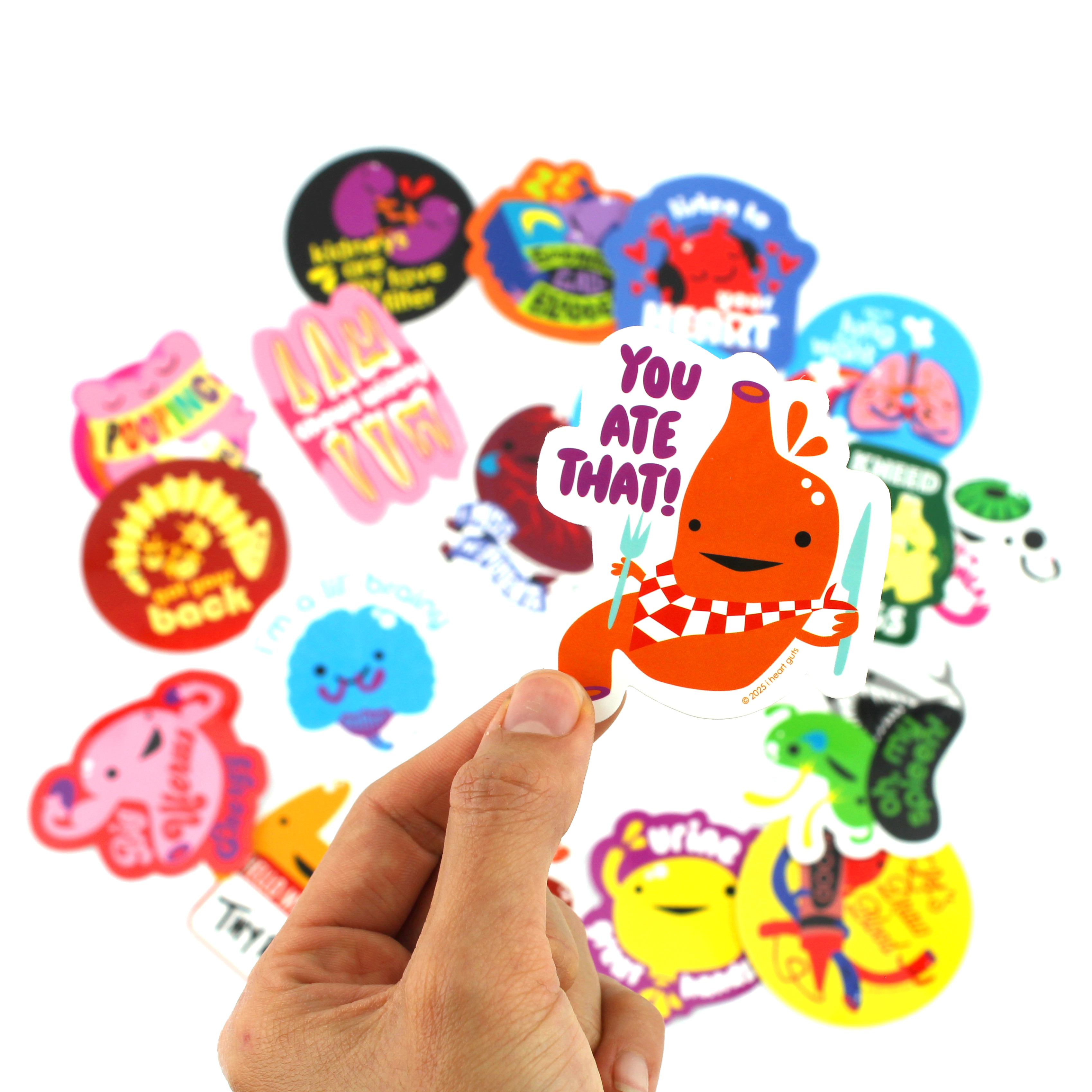 We are celebrating 20 years of I Heart Guts cute organs with this special set of 20 different cute organ sticker designs! These 2.25” outdoor-quality vinyl stickers are ready to dress up your laptop, bike, water bottle or phone case. Remember to take care of your body -- it's the only one you've got! Ages 3+.