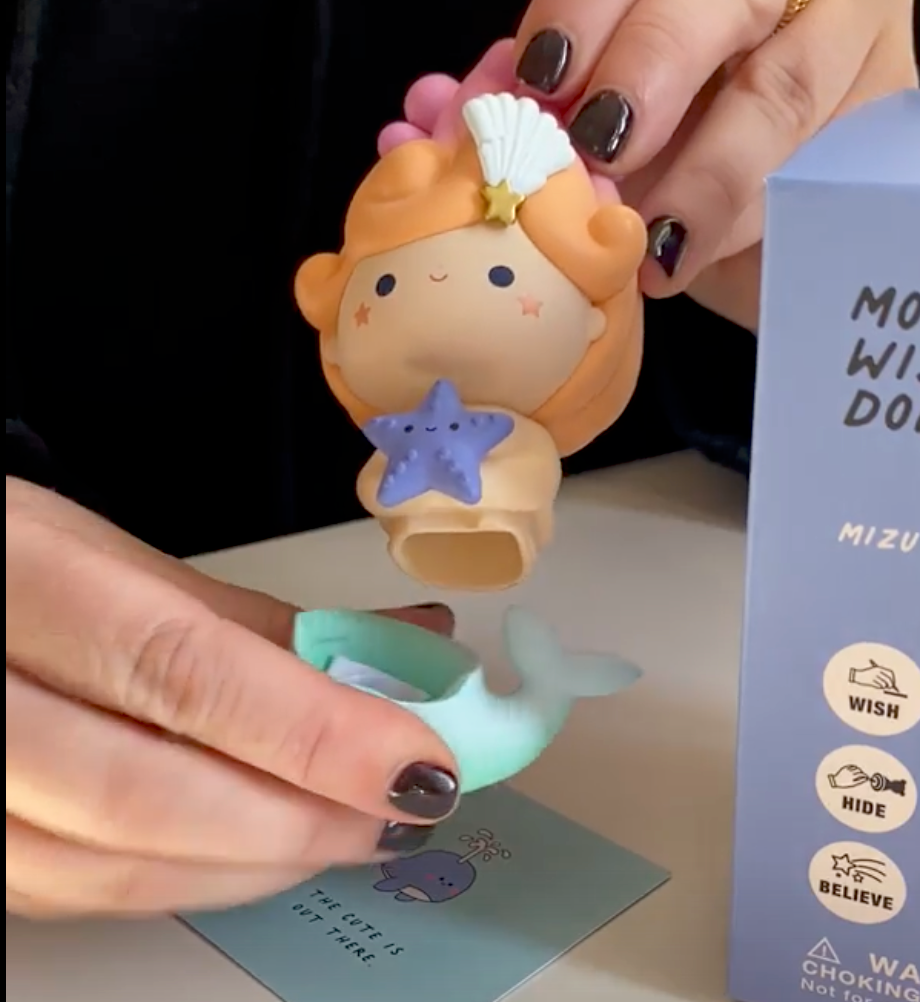 What's your biggest wish? Write it on the secret paper hidden inside the Momiji wishing doll, then place it safely back inside. This mystic mermaid is a perfect guardian for making dreams come true. 3" tall.