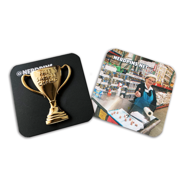 FREE SAMPLE CHAMP! You won! 1.5" inch. Gold 3d molded pin. 2 Yellow rubber back pieces. @NERDPINS logo on back. Packaged new with 2x2" inch backing card.