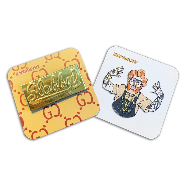 1.5" inch. 3D molded gold pins. 2 yellow rubber back pieces. @NERDPINS logo on back. Packaged new with 2x2" inch backing card.