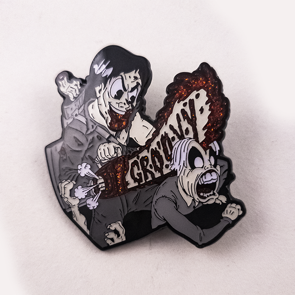 Groovy! Give them deadites a splitting headache! 2" hard enamel. Features 2 rubber backers and glitter blood.