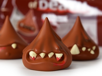 O-No Co presents Kisses.. of Death! This sweet and sentient set of deadly droplets (non-edible, mostly evil) would like nothing more than to kill you slightly quicker than their purely sugar-based counterparts. Three different 2” vinyl sculpts are wrapped in foil and sealed in a custom bag.