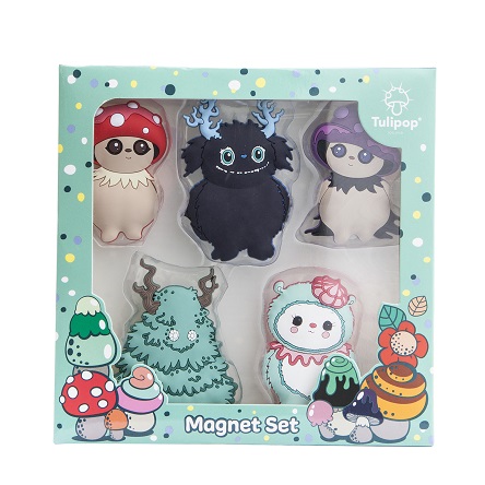 Five piece magnet set featuring the five main Tulipop characters, Bubble, Gloomy, Miss Maddy, Fred and Mr.Tree.