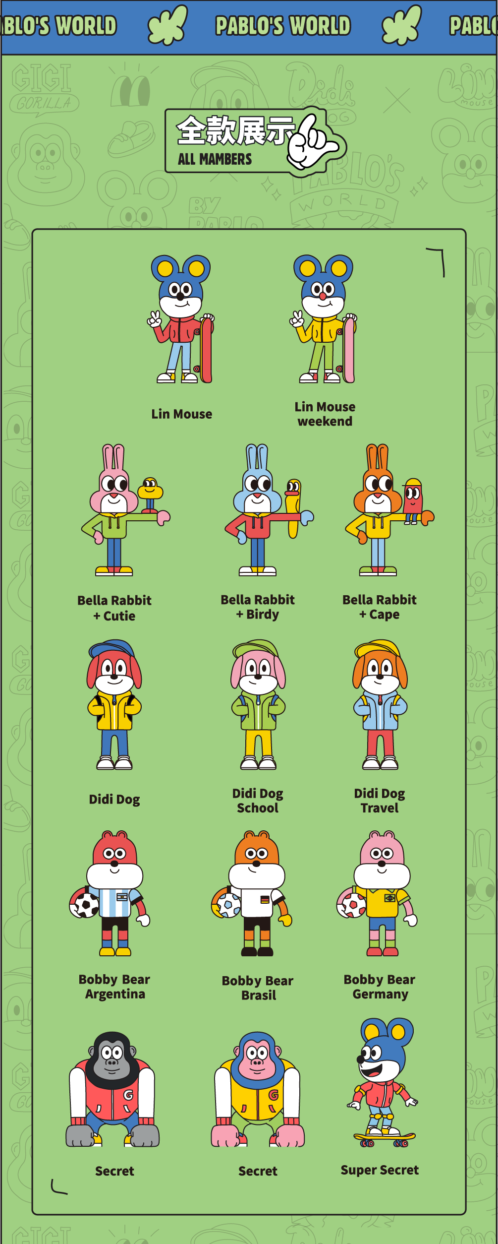 Pablo Ientile is an illustrator and animation designer, of Italian descent and nationality of Argentina. Pablo Ientile explores the mysteries of the city with active young people, and uses unconstrained youthful creativity to "live" different cities and inject fresh youthful vitality into ordinary landmarks. Urban youth blind boxes include Lin Mouse, Bella Rabbit, Didi Dog, Bobbie Bear, Gigi Gorilla. They love life and express themselves.